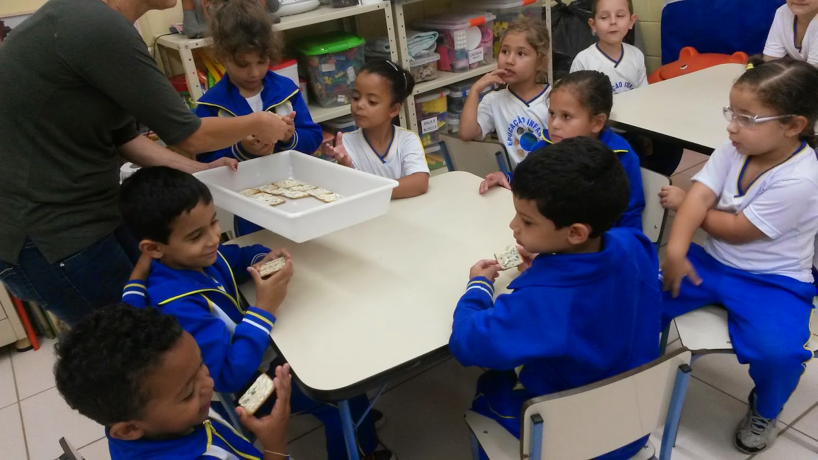 Dando continuidade ao Projeto "Escola Sustentável, os alunos do Infantil IV e Infantil II, da professora Daniela, e do Infantil V e Infantil II, da professora Carmen, experimentaram um patê feito com a salsinha e a cebolinha colhidas na horta da escola.